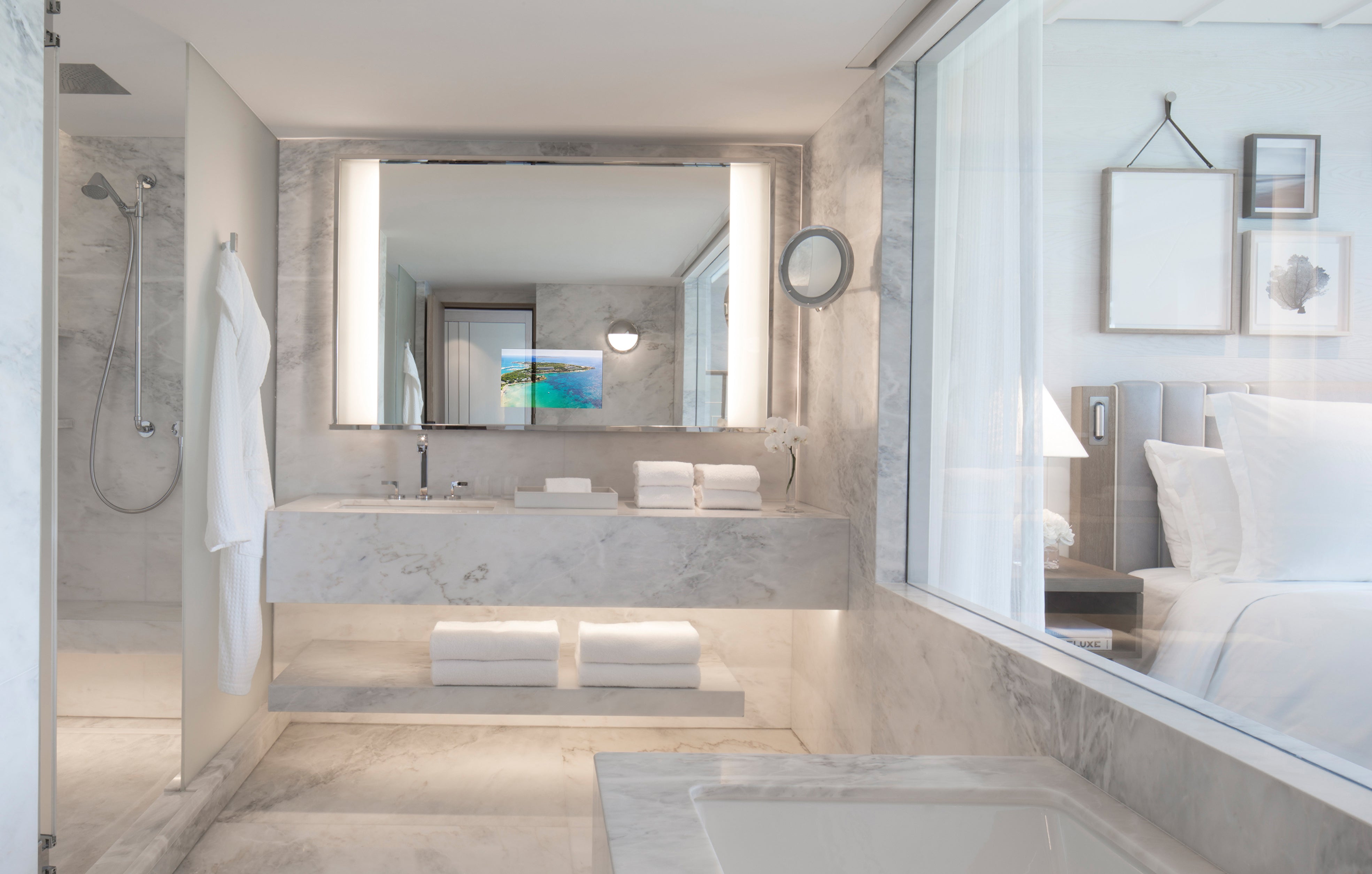 Three in one: a mirror with natural colors with the TV off; a small screen vanity infotainment system; a full screen 4K display!
