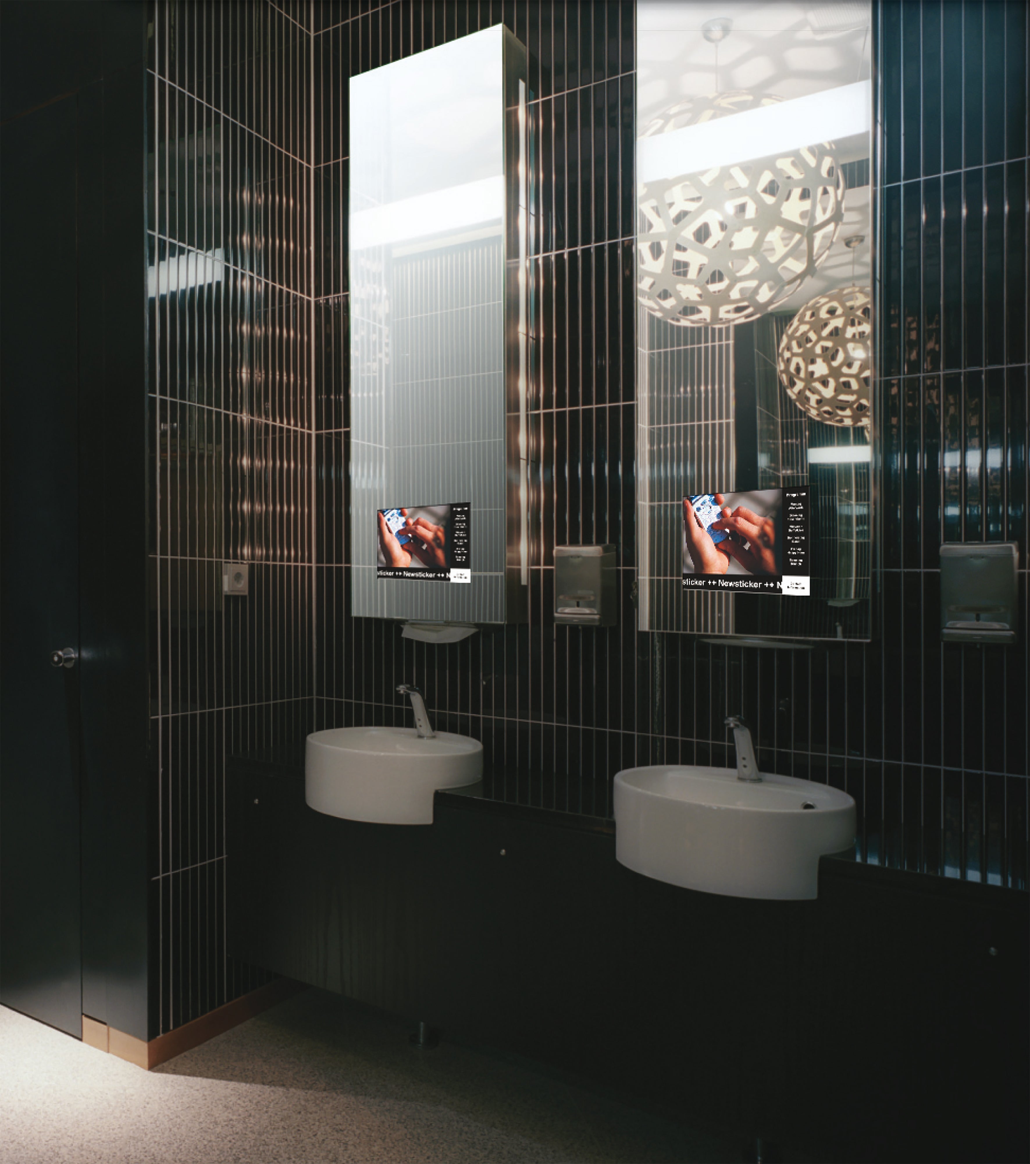 The advertisement can be controlled remotely by our CMS software and is distributed onto a screen area within a mirror from a central server.