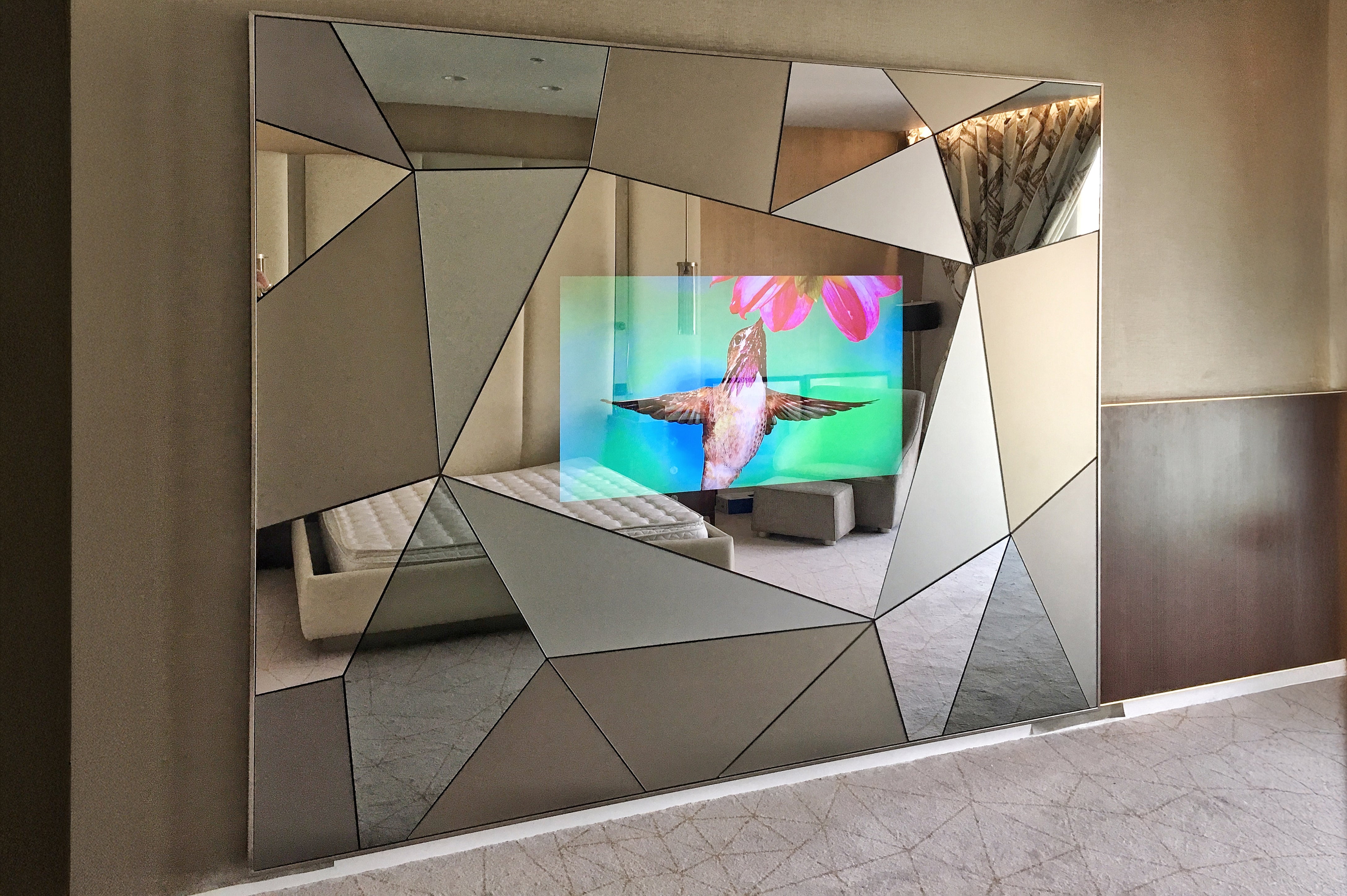 There is no gap between our screens and the glass/ mirror surface resulting in a crystal clear picture, and delivering a futuristic look as if the images are natives to the glass/ mirror.