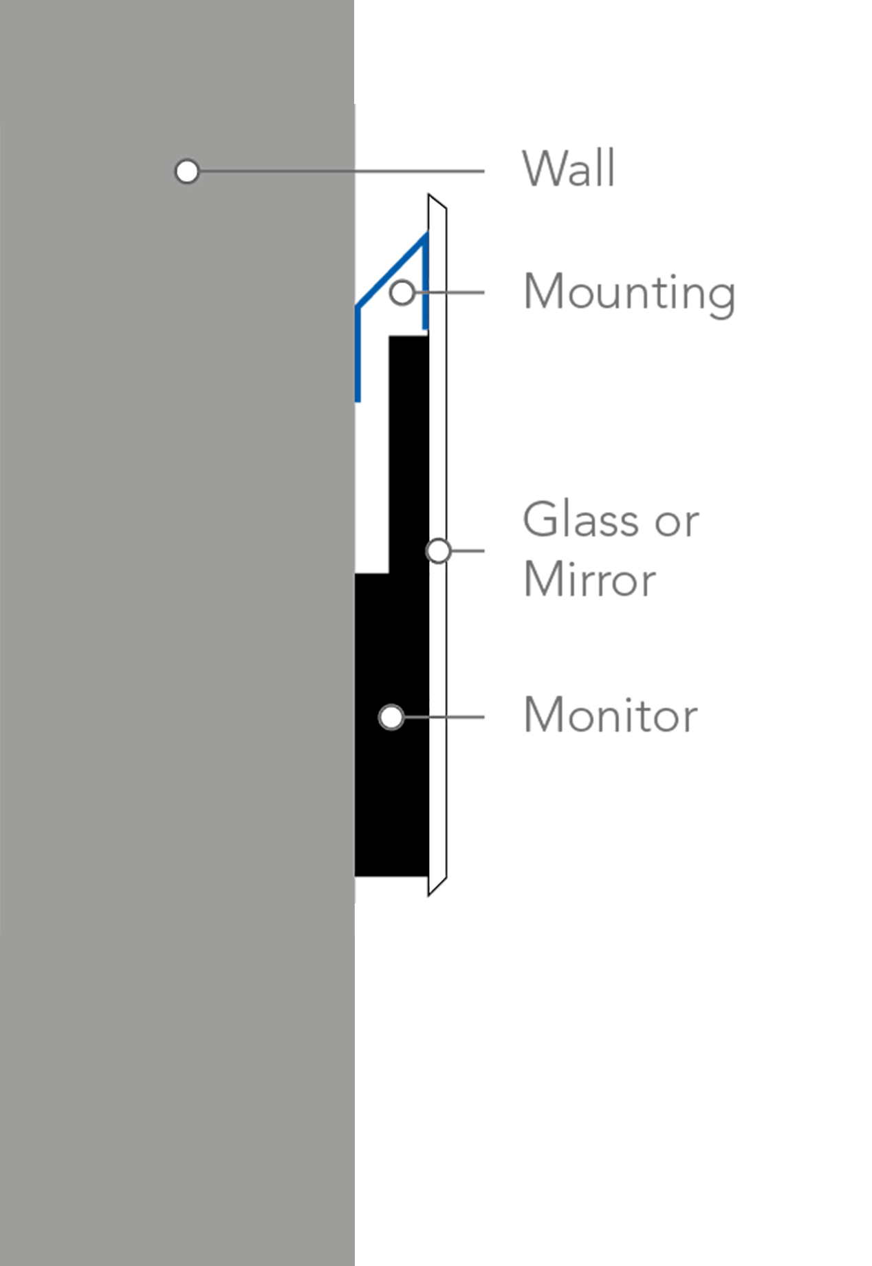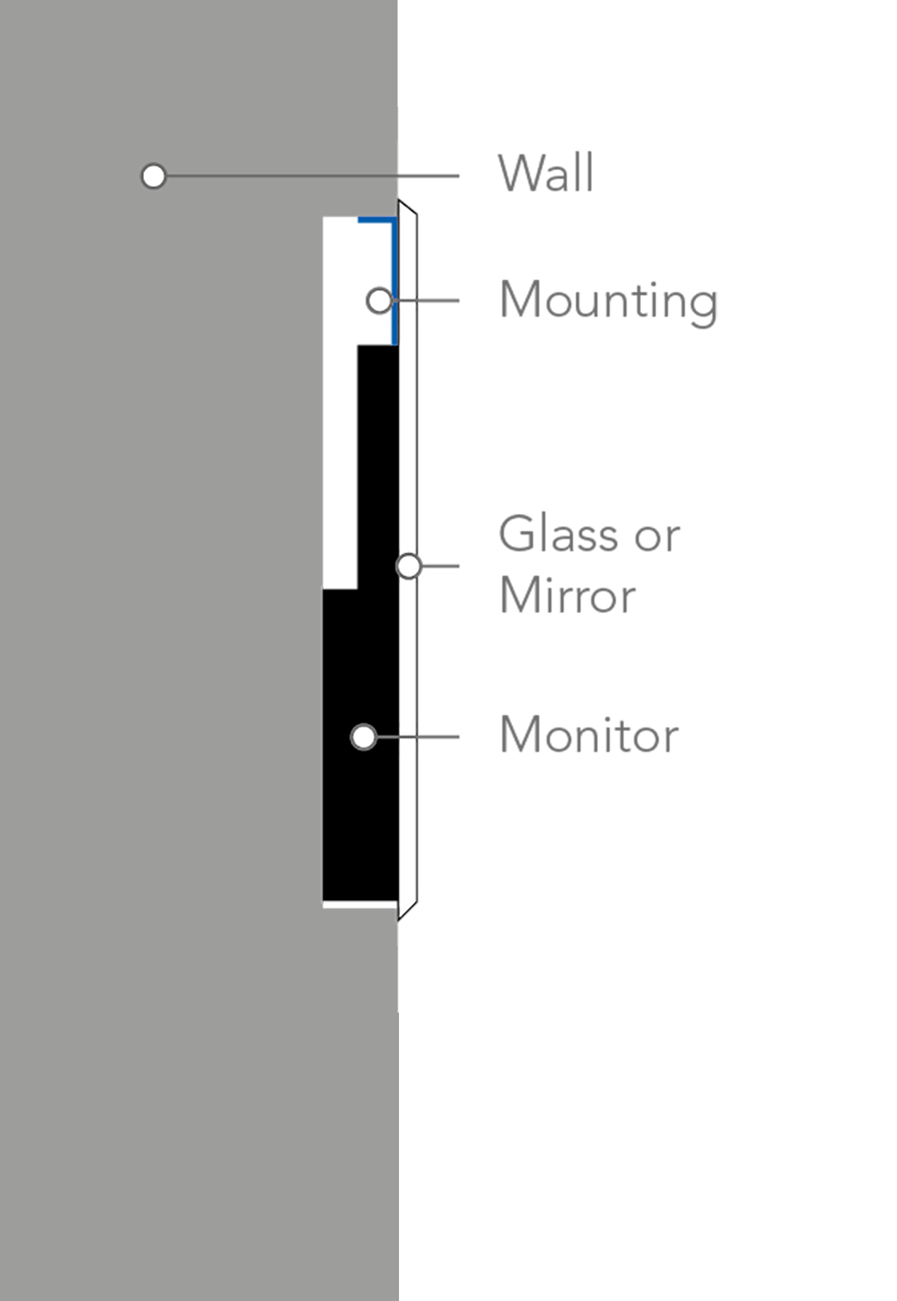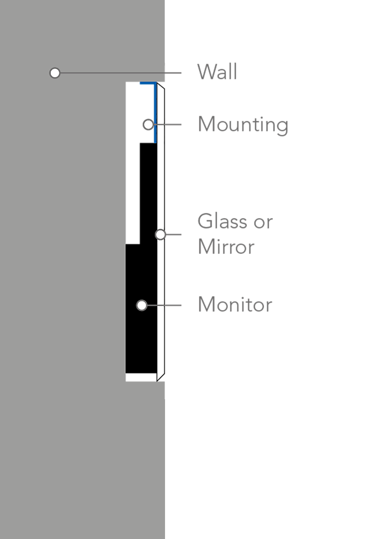 ad notam's In-Wall Mounting Flush Mount Systems integrate your complete product (screen combined with a mirror or glass panel) into a cavity particularly to fit and embed the screen, the mounting system AND the mirror or glass panel. In the end there will be no glass or mirror overlying the wall - leaving behind a flush and immaculate surface.